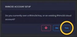 Rhino3d キーを所有しているか、既存の Rhino3d クラウドアカウントを所有しているかの確認メッセージが表示されたら「Yes」をクリックします。